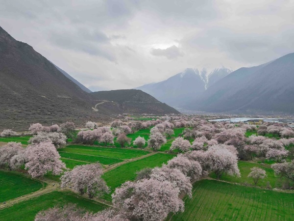 A view of peach blossoms in Bomi county of Nyingchi, Xizang autonomous region. [Photo by Palden Nyima/chinadaily.com.cn]