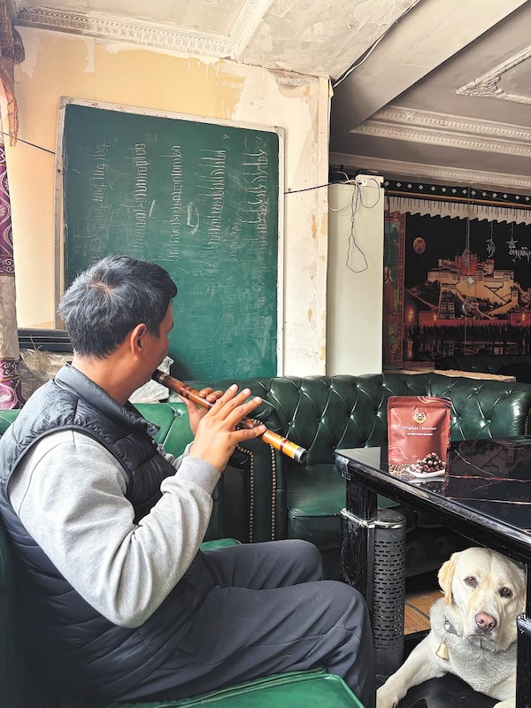 Dachung Wochen plays a bamboo flute at a teahouse in Lhasa, Xizang autonomous region, while his guide dog, Fuju, lends an ear. PALDEN NYIMA/CHINA DAILY